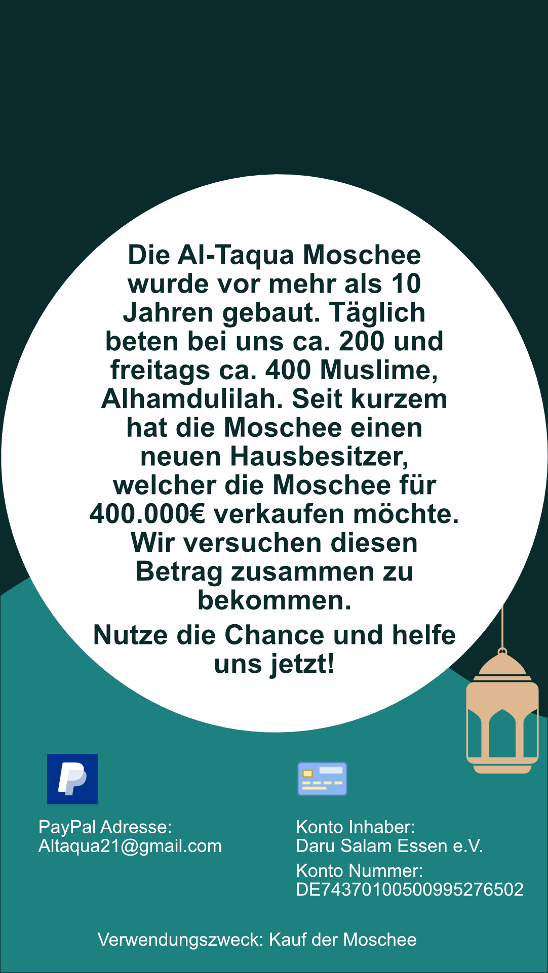 "Die Altaqua-Moschee wurde eine Woche vor dem Monat Ramadan 2011, der dem Hijri-Datum Shaaban 1433 entspricht, in der Stadt Essen im Bundesland Nordrhein-Westfalen in Westdeutschland errichtet. Im Jahr 2011 beliefen sich die Renovierungskosten auf 130.000 Euro, zusätzlich zu einer monatlichen Miete von 2000Euro